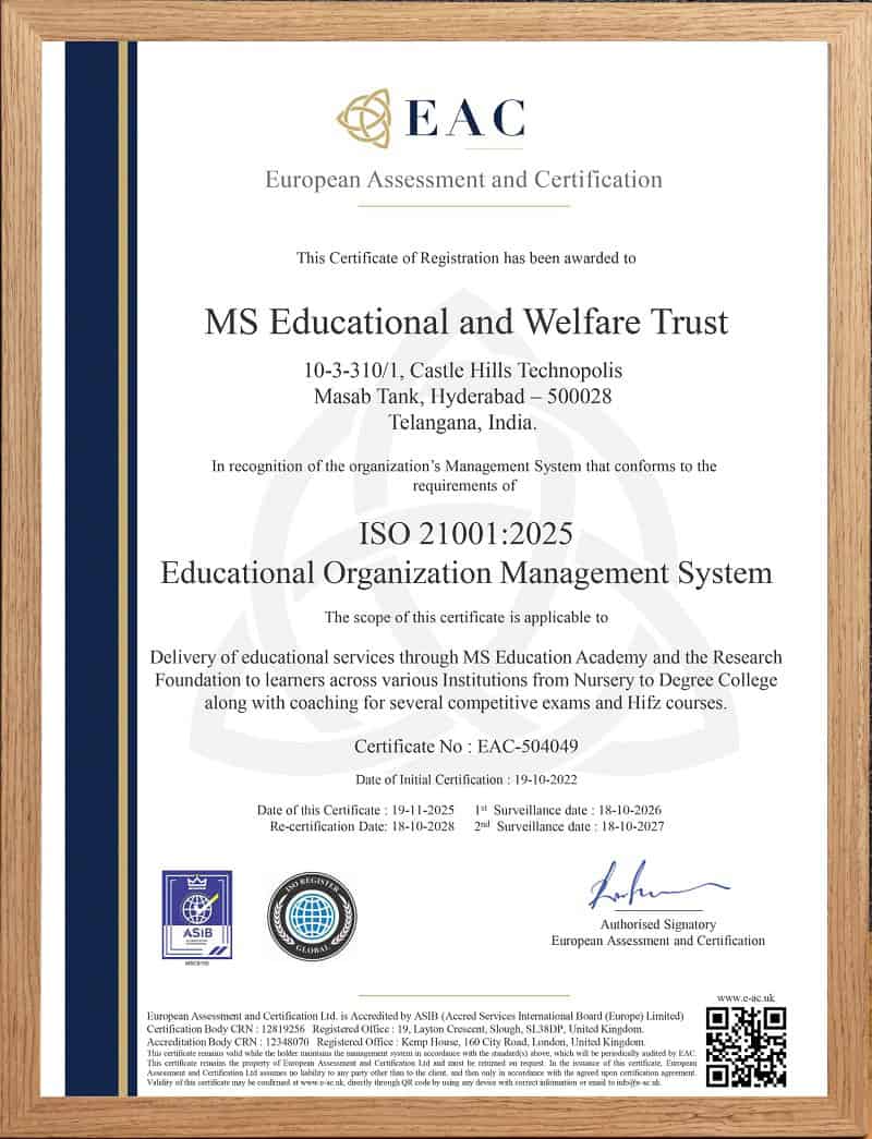 MS Education Academy is proud to be ISO 21001:2025 certified, a rare and prestigious certification issued by the European Assessment and Certification Body – demonstrating our commitment to excellence in educational management. This certification reflects our dedication to providing a high-quality, student-centric learning experience that integrates modern education with strong ethical values.